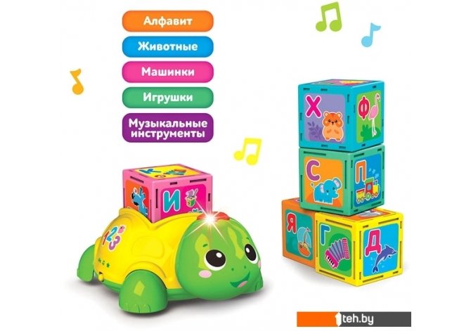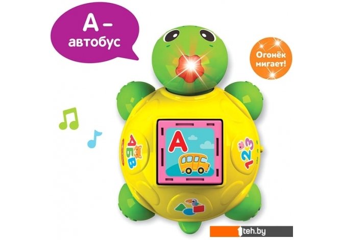 | Информация | Умная черепашка при помощи 5 обучающих кубиков поможет малышу выучить буквы! Нужно просто вставить кубик и нажать!В игрушке – 30 говорящих картинок, 4 режима («Буквы и слова», «Звуки», «Песенки», «Игры»), а также мигающие огоньки и 10 песенок («Песенка про алфавит», «Песенка про счёт», «Песенка про цвета», «Песенка про формы», «Весёлые противоположности», «Это что за чудеса», «Выходите погулять», «Пляшут весело детишки», «Что такое праздник», «Друзья»). А еще с помощью кубиков ребенок сможет сам составлять слоги и слова. Такая игра поможет закрепить знания и развить навыки чтения. |