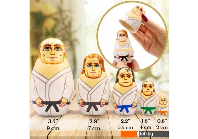 | Информация | ВЕЛИКОЛЕПНЫЙ ДИЗАЙН: Русские матрешки боевые искусства - карате, тхэквондо, джиу-джитсу, дзюдо, айкидо ЭКОЛОГИЧЕСКИЕ МАТЕРИАЛЫ И ВЕРНОСТЬ ТРАДИЦИИ РОСПИСИ: натуральное дерево, краски и лак на водной основе УНИКАЛЬНЫЙ ПОДАРОК: оригинальный предмет декора для гостиной, спальни, детской, а также для офиса, салона ИДЕАЛЬНЫЕ РАЗМЕРЫ: высота самой большой матрешки 9 см, самой маленькой - 2 см |