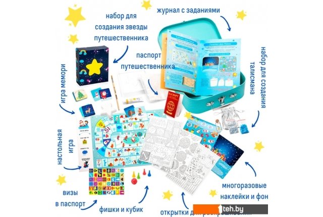 | Комплектация | книжка-инструкция с заданиями, паспорт путешественника, игра-ходилка, фишки и кубик для игры, 30 карточек для игры в «Мемо», открытки-раскраски 3 шт., набор для создания поделки «Талисман», набор для создания «Звезды путешественника» из гипса, кисточка, акриловая краска, набор наклеек для украшения чемодана, тематические наклейки. |
