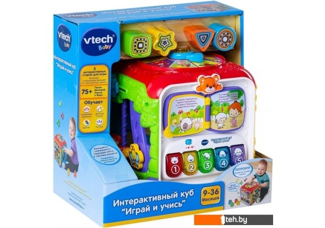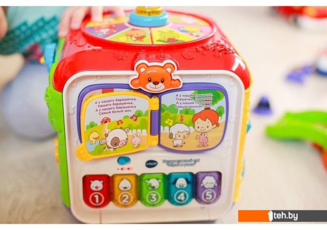 | Информация | Интерактивный куб «Играй и учись» на долгое время завладеет вниманием вашего ребенка и научит его множеству новых вещей. Пять интерактивных сторон куба обладают подсвечивающимися клавишами, сортерами, развлекательными элементами и другими очень веселыми функциями. Играя со своим большим и ярким кубом, ребенок познакомится с различными цветами, цифрами, животными, временами года и многим другим. Кроме того, в памяти игрушки содержится более 75 мелодий, песен, отдельных фраз и звуков, которые будут способствовать развитию когнитивных, зрительных, слуховых и социальных функций ребенка. |