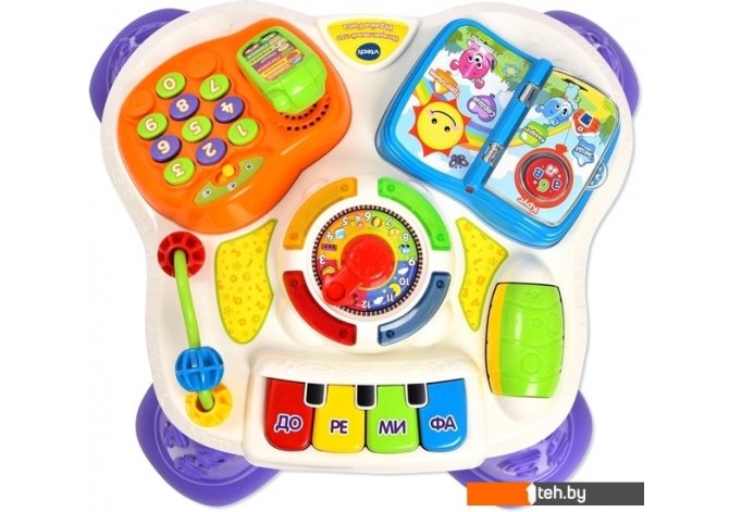 | Информация | Интерактивный стол — это детский игровой стол с электронной панелью, с помощью которого малыш сможет играть и учиться. Стол может расти с ребенком: сначала малыш может сидя играть с панелью, а потом стоя за столом.На электронной панели есть множество занимательных функций: встроенные часы с распорядком дня, телефон, интерактивная книга, веселые кнопки пианино, на котором можно играть, дорожка с бусинами и ролик для скольжения и ролевой игры.С помощью игрушки малыш научится считать, узнает про распорядок дня и время, сможет разыгрывать ролевые игры и просто весело проводить время.Интерактивный стол также содействует развитию воображения, мелкой моторики и сенсорики. |