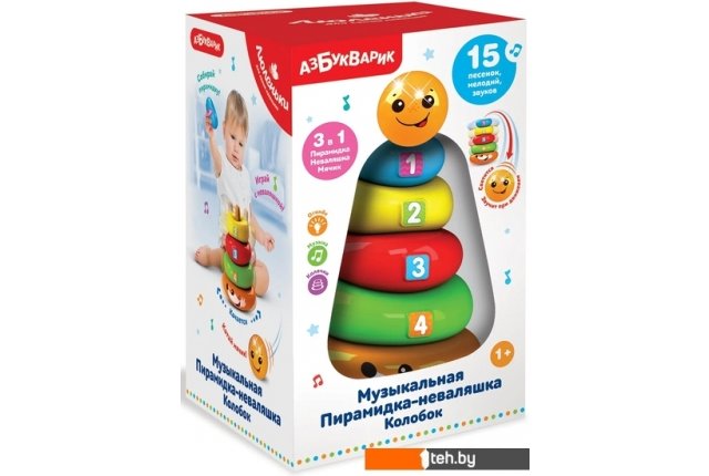 | Информация | Музыкальная игрушка 3 в 1: пирамидка, неваляшка и мячик! Собери пирамидку из разноцветных колечек, а на вершину положи мячик в виде колобка! Собрал пирамидку? Поиграй с ней, как с неваляшкой – она качается в разные стороны. Катай мячик – он звучит при движении! Слушай веселые песенки и мелодии («Много есть цветов прекрасных», «Прятки», «Песенка про счёт», «Чижик-пыжик», «Немецкая полька» и др.), забавные звуки. Огоньки на мячике мигают под музыку и дарят отличное настроение. Игрушка отлично подходит для малышей от 1 года. Колечки разного цвета и размера развивают логическое мышление, песенки и звуки развивают слуховое восприятие, игры с мячиком и неваляшкой стимулируют двигательную активность и мелкую моторику. |