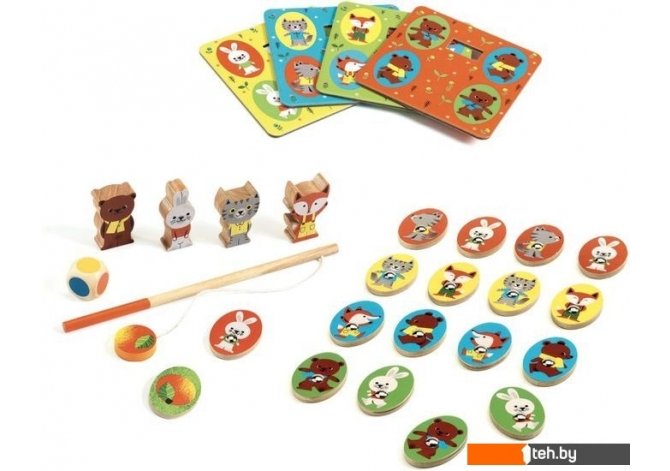 | Комплектация | 4 игры: 1 - магнитная рыбалка (16 деревянных фишек с магнитом, удочка), 2- игра мемори (16 деревянных фишек, они же используютс для игры рыбалка), 3 - лото (4 игровых поля, 16 жетонов) , 4 - ходилка (коробка является полем для игры, 4 деревянных фигурки-персонажа, 1 кубик) |