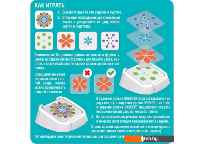 | Комплектация | В комплекте: 1 подставка, 16 прозрачных плиток с узорами, буклет с заданиями. |