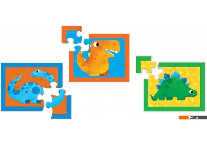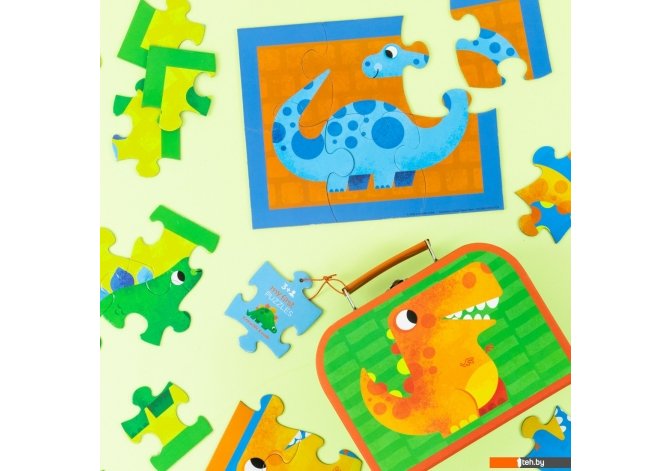 | Информация | - Пазл «Динозавры» серии My First Puzzles — отличный вариант подарка для маленьких любителей головоломок. - В комплекте три пазла различной степени сложности, количество деталей варьируется от 6 до 12. - Набор упакован в прочный футляр-чемоданчик с удобной ручкой для переноски, благодаря чему пазлы легко можно брать с собой в дорогу. - Игра способствует развитию моторики, концентрации и пространственного мышления. - Подходит для детей от 3-х лет. |