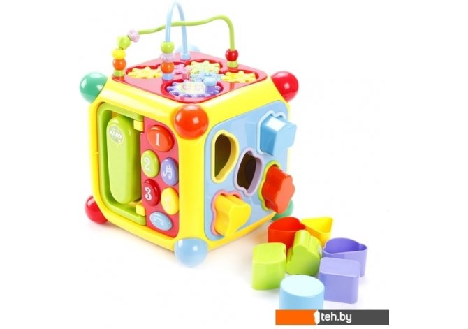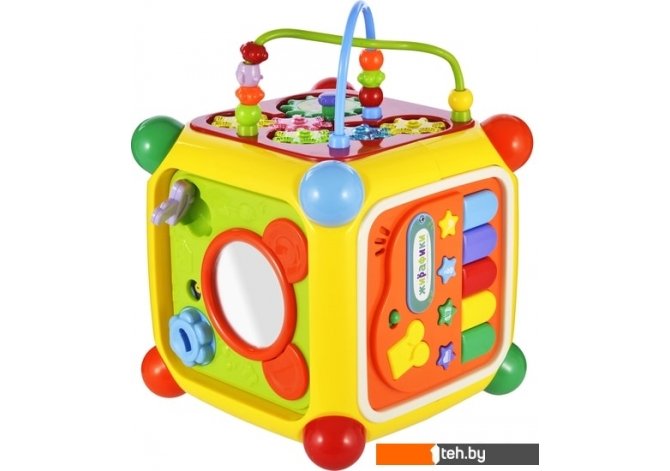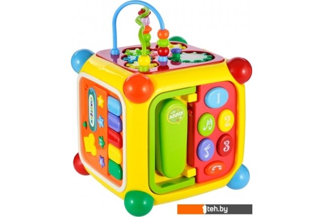 | Информация | Это настоящий многофункциональный игровой центр! На каждой стороне куба - разные развивающие игры. На двух сторонах расположены сортеры - фигурные отверстия, через которые малыш должен протолкнуть внутрь куба фигурные элементы. На третьей стороне - игрушка-лабиринт с разноцветными колечками и шестеренки, которые можно вращать. Четвертая сторона - это телефон для малышей с большими кнопками. Игра с телефоном сопровождается различными звуками и мелодиями, звук включается с помощью кнопки on / off , расположенной на этой же стороне. Здесь же есть складная ручка для переноски куба. Пятая сторона - музыкальное пианино со своим отдельным переключателем питания on / off . У пианино - пять клавиш разного цвета и четыре функциональных кнопки с изображением музыкальных инструментов. При нажатии на функциональные кнопки звучание пианино становится похожим на звучание соответствующего музыкального инструмента. Еще одна кнопка в виде ноток, расположенная здесь же, включает режим проигрывания мелодий. Шестая сторона - это дверца, с помощью которой куб можно открывать. Дверца открывается ключиком, присоединенным к этой же стороне с помощью веревочки. Игрушка работает от 4 батареек ААА. Батарейки входят в комплект. |