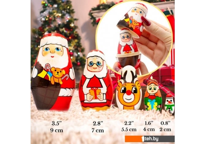 | Информация | ВЕЛИКОЛЕПНЫЙ ДИЗАЙН: Матрешки в виде мистера и миссис Клаус, Оленя, Эльфа, Снеговика для рождественского декора ЭКОЛОГИЧЕСКИЕ МАТЕРИАЛЫ И ВЕРНОСТЬ ТРАДИЦИИ РОСПИСИ: натуральное дерево, краски и лак на водной основе УНИКАЛЬНЫЙ ПОДАРОК: оригинальный предмет декора для гостиной, спальни, детской, а также для офиса, салона ИДЕАЛЬНЫЕ РАЗМЕРЫ: высота самой большой матрешки 9 см, самой маленькой - 2 см |
