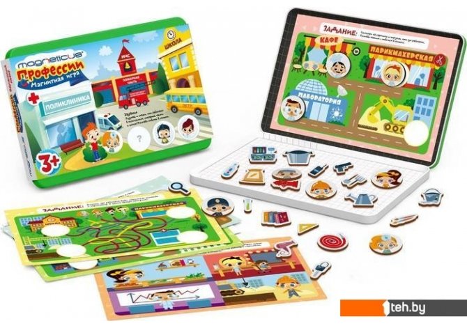 | Информация | Обучающий набор «Профессии» разработан для детей дошкольного возраста. В него включены игра-ходилка вместе с магнитными переодеваниями, 20 интересных игровых заданий на тему «Профессии» и 60 магнитных элементов для их выполнения. Набор упакован в удобную металлическую коробку, которую можно взять с собой в любую поездку. Красочные карточки и магнитные элементы, а также увлекательные задания неизменно вызывают интерес у детей дошкольного возраста. С развивающим набором «Профессии» ребенок не заскучает в дороге, в гостях, на прогулке, с пользой проведет время, выполняя задания. Увлекательный и красочный набор развивает логическое мышление и помогает ребенку познакомиться с различными профессиями. В комплекте: 60 магнитных элементов; 20 заданий на тему «Профессии»; 1 игра-ходилка + магнитные переодевания. |