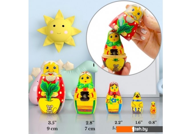 | Информация | ВЕЛИКОЛЕПНЫЙ ДИЗАЙН: Матрешки по мотивам русской народной сказки Репка ЭКОЛОГИЧЕСКИЕ МАТЕРИАЛЫ И ВЕРНОСТЬ ТРАДИЦИИ РОСПИСИ: натуральное дерево, краски и лак на водной основе УНИКАЛЬНЫЙ ПОДАРОК: оригинальный предмет декора для гостиной, спальни, детской, а также для офиса, салона ИДЕАЛЬНЫЕ РАЗМЕРЫ: высота самой большой матрешки 9 см, самой маленькой - 2 см |