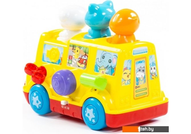 | Информация | Автобус выполнен из качественного пластика, имеет яркий дизайн и округлую форму деталей. Поставляется в яркой коробке.Конструкция автобуса предполагает наличие мест для пассажиров: котёнка, утёнка и щенка. Животных можно менять местами.Для того, чтобы игрушка начала движение, нужно нажать на фигурку на переднем сиденье. Малыш услышит звук зажигания, лобовое стекло машинки засветится, начнётся проигрывание мелодий, и автобус поедет.Когда игрушка движется, животные танцуют. Если перед автобусом возникнет препятствие, он самостоятельно развернётся и поедет в другую сторону.Конструкция автобуса предполагает наличие дополнительных озвученных элементов для игры. Элемент в виде ключика имитирует звук зажигания при повороте. Элемент в виде кнопки имитирует звук сигнала автомобиля. А элемент в виде рычага имитирует звук тормоза. |