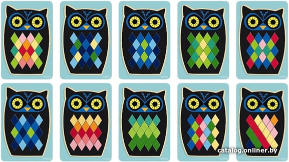 Комплектация | - основа-сова,- 10 карточек с заданиями,- 57 маленьких разноцветных ромбов. |