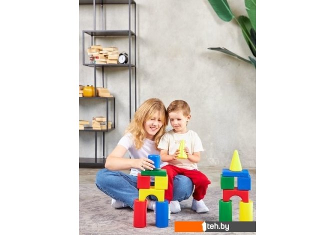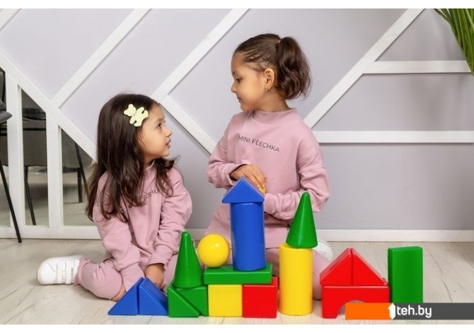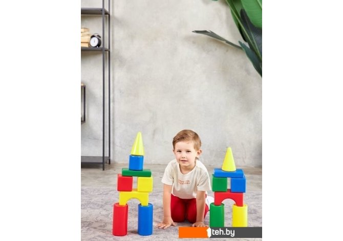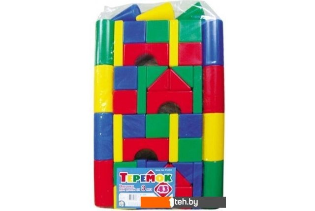 | Информация | Строительный набор «Теремок 43» в пакете из выдувной пластмассы состоит из: Кубик — 8?8 см — 8 шт. Большой цилиндр — 8?16 см — 8 шт. Малый цилиндр — 8?8 см — 4 шт. Конус — 8?13 см — 2 шт. Треугольная призма — 8?8 см — 8 шт. Прямоугольная призма - 16?8?3 см — 8 шт. Шар — 8 см — 1 шт. Арка — 16?8?8 см — 4 шт. |