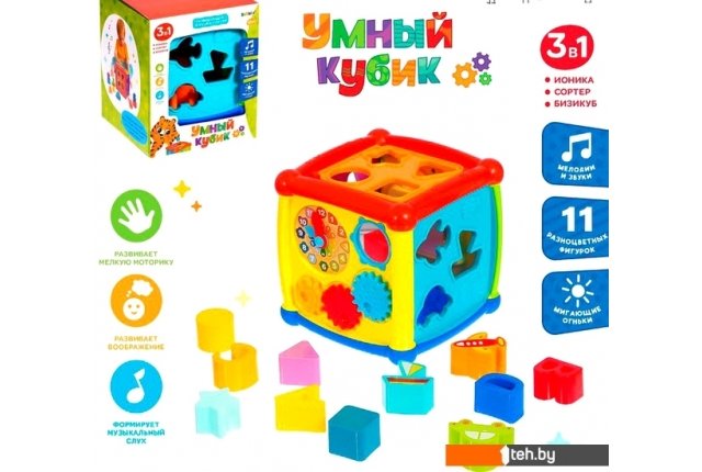 | Информация | Игрушка «Умный кубик» разработана специально для малышей старше 1 года. В неё входит сразу 3 развивающих элемента: ионика, сортер и бизикуб. С ними ребёнок не только отлично потренирует мелкую моторику и музыкальное восприятие, но и запомнит цвета и формы. Как играть?Предложите малышу вставить фигурки в соответствующие отверстия в сортере. Пусть малыш нажмёт клавиши на ионике — он услышит весёлые песенки, ноты и звуки животных. Используйте фигурки для изучения цветов и форм. Для работы необходимы 3 батарейки типоразмера AA, в комплект не входят. Рекомендовано детям старше 1 года. |