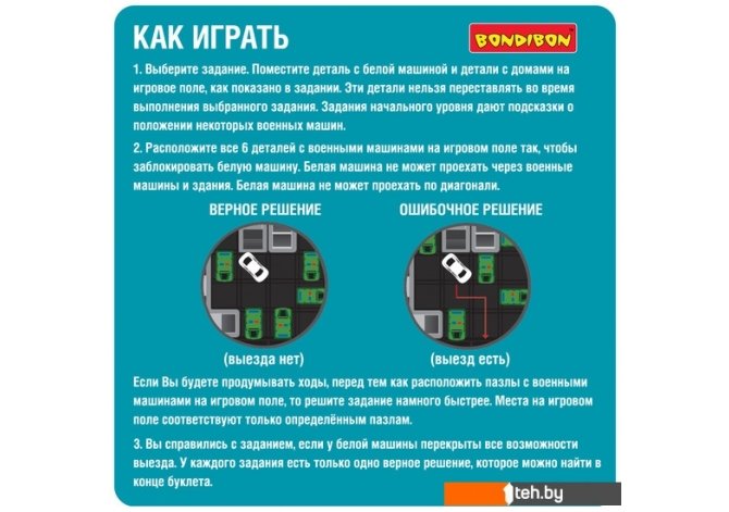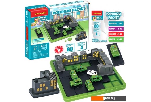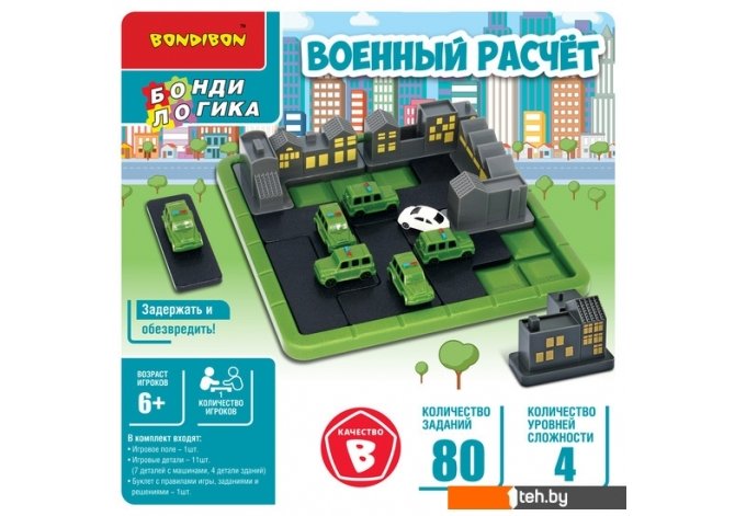 | Информация | Задержать и обезвредить! В настольной игре "ВОЕННЫЙ РАСЧЁТ" от Bondibon Вы можете помочь военным, которые хотят поймать злодея в белом автомобиле. Используйте свой ум, чтобы поймать его в ловушку. Помимо интеллекта логическая игра позволяет развивать внимание, пространственное мышление, зрительно-моторную координацию. Выберите задание. Поместите белую машину и здания указанным в задании образом. А теперь расположите все детали с военными машинами так, чтобы белый автомобиль не имел никакого пути для выезда и бегства. У каждого задания есть только одно верное решение. 80 захватывающих миссий, 4 уровня сложности! В комплекте: игровое поле - 1шт, игровые детали - 7 машинок и 4 здания, буклет с правилами игры, заданиями и решениями. Батарейки не понадобятся. Игра для 1 игрока. Возраст 6+. Серия "БондиЛогика". Головоломка "ВОЕННЫЙ РАСЧЁТ" – логичный подарок для игроков всех возрастов! |