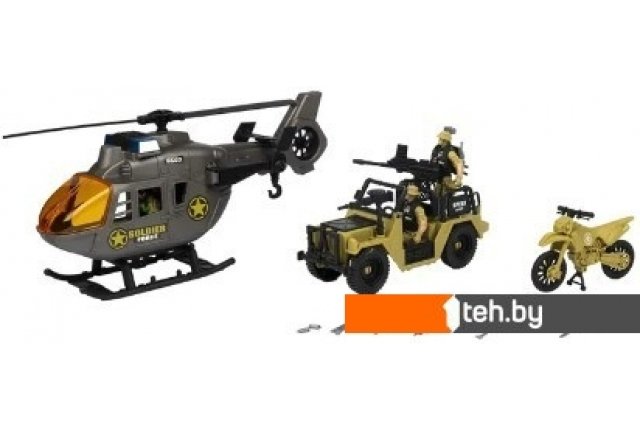 | Информация | Игровой набор солдатиков с техникой и аксессуарами занимательный набор для игры в солдатики. В наборе: вертолёт, военная машина, мотоцикл, оружие, 3 солдатика и прочий инвентарь для осуществления миссии. Фигурка солдата с подвижными частями тела. Набор прекрасно развивает воображение, мелкую моторику рук и координацию движений. |