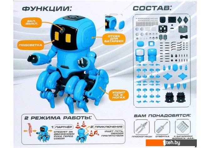 | Информация | Робот-конструктор MAXX способен выполнять множество функций: он видит препятствия и реагирует на жесты. Ребёнок сможет самостоятельно собрать многофункционального современного робота, в процессе изучая робототехнику. Особенности:светятся глаза, обходит препятствия, следует за рукой (жесты), ходит на 8 ногах. Для работы требуется 4 батарейки типа AAA (в комплект не входят). |
