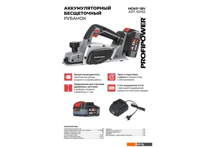 Если хотите купить рубанок Profipower MDKP-18B (с 1-им АКБ) то следует уточнить все параметры и габариты модели перед покупкой. Представленые характеристики на сайте 1teh.by могут отличаться от действительных или указанных производителем. Описание, фото товара и технические характеристики представлены для справки.