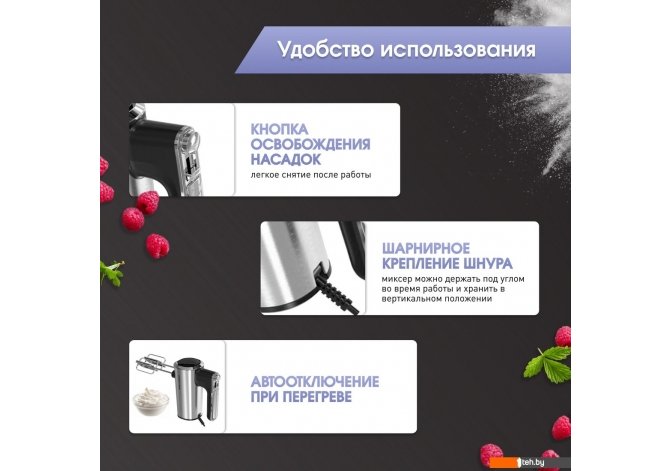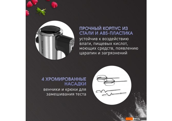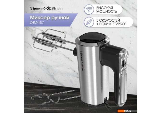 | Информация | Миксер ZHM-157 от компании Zigmund & Shtain – это функциональный кухонный прибор, призванный облегчить домашний труд хозяйки. Он позволяет легко и быстро взбить крем, смешать ингредиенты или замесить тесто. В комплекте идут 2 венчика для взбивания и 2 крюка для замешивания теста. Миксер отличает большая мощность 600 Вт, надежный АС-двигатель, 5 скоростей для различных видов ингредиентов, режим Турбо для интенсивной обработки продуктов, прочный стальной корпус, стильный дизайн и компактные размеры. Он удобен в эксплуатации за счет шарнирного крепления шнура, который позволяет держать миксер под углом во время работы и ставить его в вертикальное положение при хранении. Насадки надежно фиксируются на корпусе и легко снимаются при помощи специальной кнопки. |