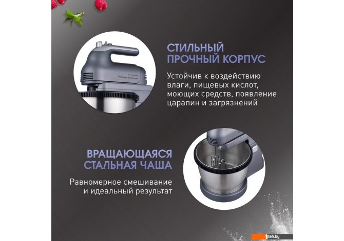 | Информация | Миксер с чашей ZHM-160 позволяет легко и быстро взбить крем, смешать ингредиенты или замесить тесто. В комплекте идут 2 венчика для взбивания и 2 крюка для замешивания теста. Миксер отличает большая мощность 800 Вт, надежный AC-двигатель, 5 скоростей для различных видов ингредиентов, режим Турбо для интенсивной обработки продуктов, стильный дизайн и компактные размеры. Насадки надежно фиксируются на корпусе и легко снимаются при помощи специальной кнопки. Миксер можно использовать как ручной, так и стационарный. Основное преимущество перед обычным ручным миксером – это отсутствие необходимости длительное время держать его в руке – необходимо только загрузить в чашу ингредиенты, установить прибор на подставку и нажать кнопку. За короткое время прибор обработает большое количество продуктов, замесит тесто, взобьет крем, приготовит мусс, пюре или соус. Он оснащен подставкой с откидным кронштейном и вращающейся во время работы чашей, что обеспечивает равномерное смешивание ингредиентов и получение быстрого и идеального результата. |