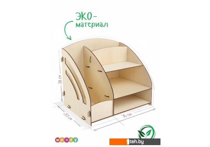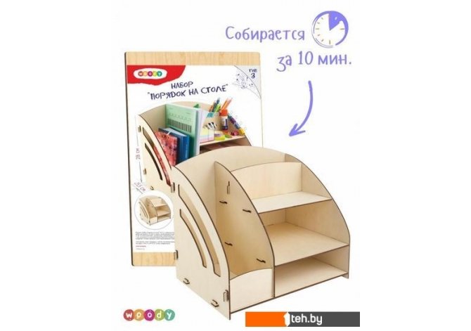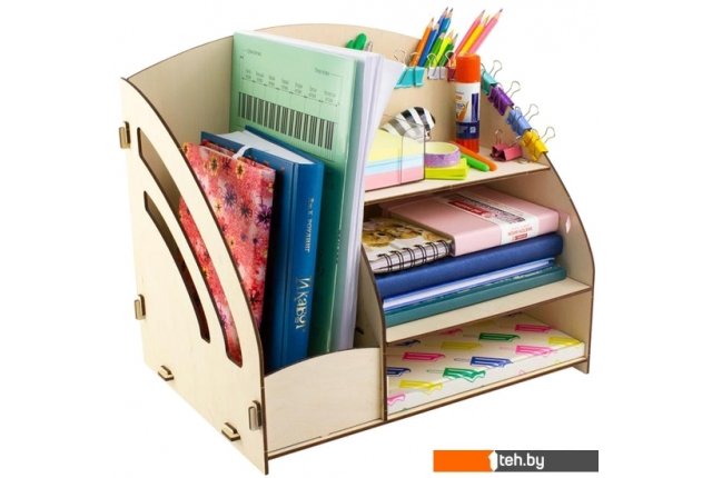 | Информация | Ручки и карандаши «убегают» со стола, тетрадки «прячутся» то в полке, то в рюкзаке, а ластик и вовсе закатывается под стол? Набор «Порядок на столе» тип 3 – лучшее решение для комфортной организации пространства на рабочем столе. Все необходимое в одном месте! Набор легко собирается из 35 деталей с помощью подробной инструкции и содержит: 1 вертикальный отсек для хранения альбомов и тетрадей; 2 глубоких горизонтальных полки для учебных карточек, тетрадей, пеналов; 1 полка для размещения милых душе декоративных предметов; 2 отделения для ручек, карандашей, фломастеров и других канцелярских принадлежностей. Нужно что-то особенное? Фантазируйте! Разукрасьте и декорируйте деревянный органайзер по своему вкусу карандашами, фломастерами, красками, гелевыми ручками, декорируйте пуговицами, самоклеящимися стразами, наклейками и др. |