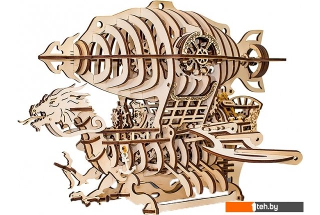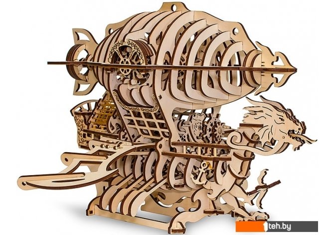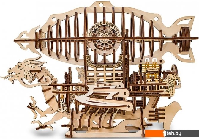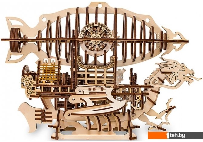 | Информация | Механический конструктор - дирижабль. Модель оснащена резиномотором, при помощи которого приводится в движение воздушный винт и обеспечивается синхронное движение вёсел. Трехмерный дракон на носу и художественная проработка деталей воздушного корабля усиливают эффектность модели, а сложный и миниатюрный механизм вызывает особый интерес. Собранная модель позиционируется как настольный вариант на подставке и приспособлена для подвешивания. |