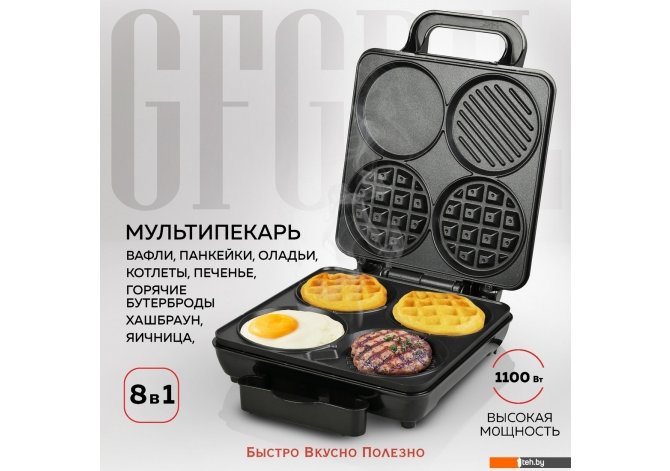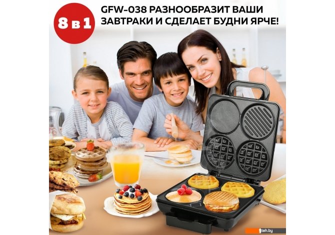 | Информация | - Мультипекарь 8 в 1 GFW-038 позволяет приготовить разнообразные блюда: вафли, панкейки, оладьи, бутерброды, печенье, яичницу, омлет, хашбраун, котлету для бургера и бекон. - Этот прибор объединяет в себе функции омлетницы, сендвичницы, бутербродницы, вафельницы, электрогриля и сковороды. |