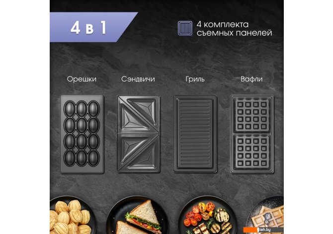 | Рабочая поверхность | гриль-пластина, форма для 2 ломтиков хлеба, вафельница, орешница |