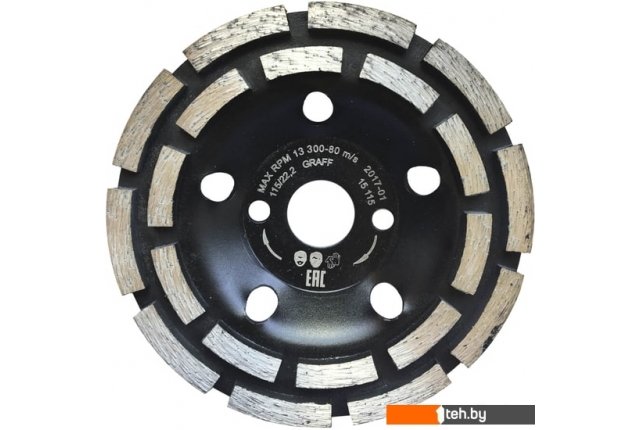 | Информация | Мощная двухрядная алмазная чашка диаметром 115 мм, по бетону GRAFF, для быстрой обработки поверхности, что достигается за счет большего содержания алмазной крошки в сегменте - профессиональная алмазная чашка для шлифовки бетона, легкоармированного бетона, гранита, искусственного и природного камня, керамической и тротуарной плитки. Количество шлифовальных сегментов равно 18.Параметры двухрядной алмазной чашки: 115x22,2x5x8,0x9 - где 115 мм - диаметр, 22,2 мм - посадочное отверстие, 5 мм - высота сегмента, 8 мм - ширина рабочей поверхности сегмента, 9 - количество сегментов в одном ряду.Максимальная скорость вращения 13300 оборотов в минуту. |