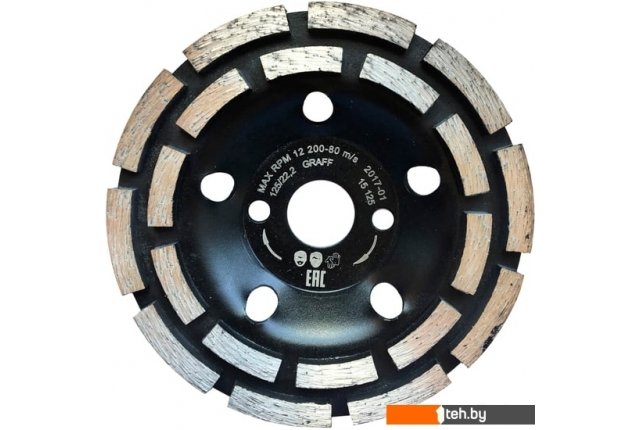 | Информация | Мощная двухрядная алмазная чашка диаметром 125 мм по бетону GRAFF для быстрой обработки поверхности, которая достигается за счет большего содержания алмазной крошки в сегменте - профессиональная алмазная чашка для шлифовки легкоармированного бетона, бетона, гранита, искусственного и природного камня, керамической и тротуарной плитки. Количество шлифовальных сегментов равно 20.- 125x22,2x5x8,0x10 - где 125 мм - диаметр, 22,2 мм - посадочное отверстие, 5 мм - высота сегмента, 8 мм - ширина рабочей поверхности сегмента, 10 - количество сегментов в одном ряду.Максимальная скорость вращения - 12200 оборотов в минуту. |