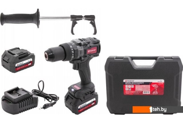 | Комплектация | - Дрель-шуруповерт ударная аккумуляторная - Рукоятка удлиненная - Скоба для подвеса - Батарея, аккумуляторная 21V/4Aч - 2 шт. - Зарядное устройство - Пластиковый кейс |