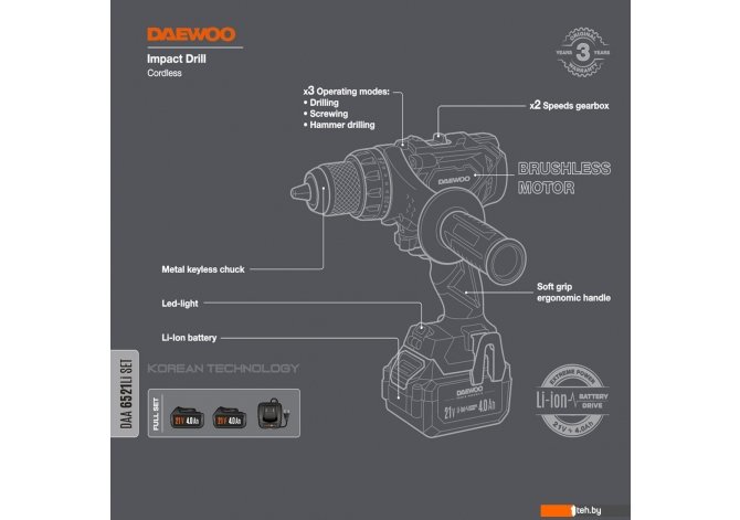 Фотографии, описание и технические характеристики модели Daewoo Power DAA 6521Li Set (с 2-мя АКБ, кейс) взяты из открытых источников, официального сайта производителя или представительства Daewoo Power в Республике Беларусь.