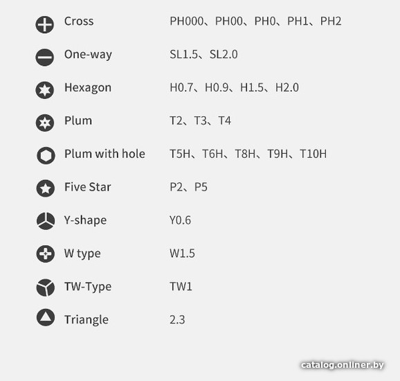 Информация | Набор включает в себя аккумуляторную отвертку и 25 бит: 2.3, H0.7, H0.9, P2, P5, PH00, PH000, SL1.5, SL2.0, T10H, T2, T3, T4, T5H, T6H, T8H, T9H, TW1, W1.5, Y0.6, крестообразная PH0, крестообразная PH1, крестообразная PH2. Фирменные биты из набора необходимы для ремонта бытовой электроники, ноутбуков, смартфонов и оснащены специальными наконечниками для ровного выкручивания и вкручивания различных винтов. Емкость аккумулятора электрической отвертки составляет 300 мАч, что позволяет вкрутить до 200 винтов на одном заряде. 25 бит из легированной стали S2 компактно размещены в магнитном футляре. Каждая бита закреплена, не смещается при встряхивании и оснащена пиктограммой с указанием типа. Весь комплект легко помещается в карман или компактно размещается на монтажном коврике. |
