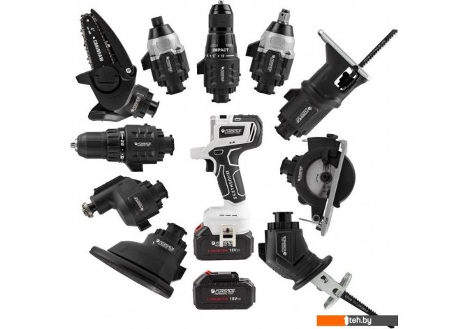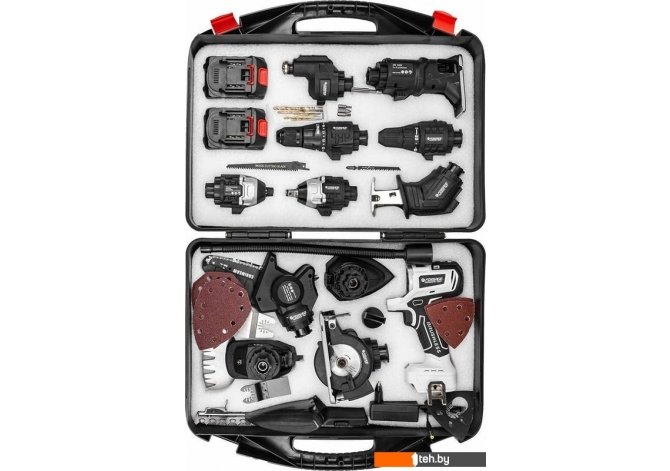 | Комплектация | - Основной блок для насадок 1шт.; - Насадка ножницы-кусторез 1 шт.; - Сверлильная головка 1шт. (с 6 спиральными сверлами, 3 битами и 1 держателем бит); - Головка ударной дрели 1шт.; - Головка ударной отвертки 1шт.; - Головка ударного гайковерта 1шт.; - Головка сабельной пилы 1шт.(с 1 лезвием для резки дерева 150 мм); - Головка лобзика 1шт. (с 1 лезвием для резки дерева 100 мм); - Головка циркулярной пилы 1шт.(с лезвием 1 шт. 85 мм); - Головка электропилы 1шт. (с цепью 1 шт.); - Осциллирующая головка инструмента 1шт.(с аксессуарами 5 шт.); - Шлифовальная головка 1шт.(с шлифовальной бумагой 2 шт.); - Аккумулятор 4,0 Ач 2шт.; - Зарядное устройство 1шт.; - Кейс. |