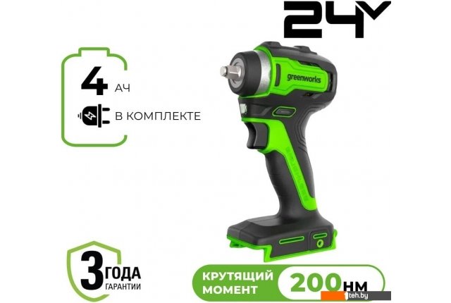 | Комплектация | - Гайковерт ударный Greenworks G24IW200; - 1 хАКБ 4Ач; - 1 х Зарядное устройство; - Руководство по эксплуатации; - Гарантийный талон; - Картонная коробка. |