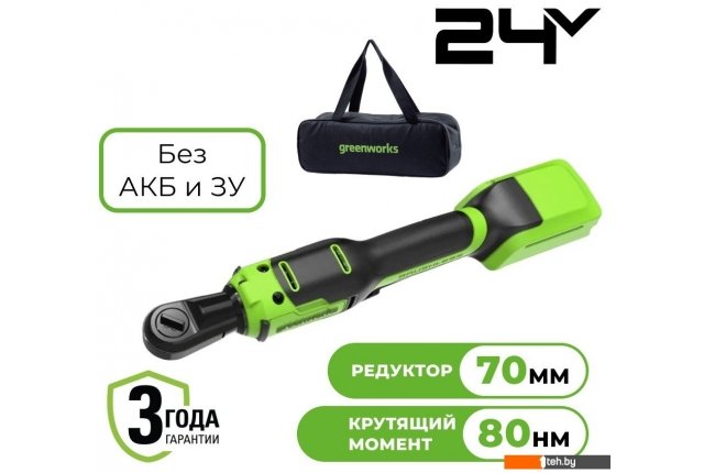 | Комплектация | - Гайковерт-трещотка Greenworks GD24RW; - Гарантийный талон; - Прочная сумка для переноски/перевозки; - Картонная коробка. Внимание: этот артикул поставляется без АКБ и ЗУ. |