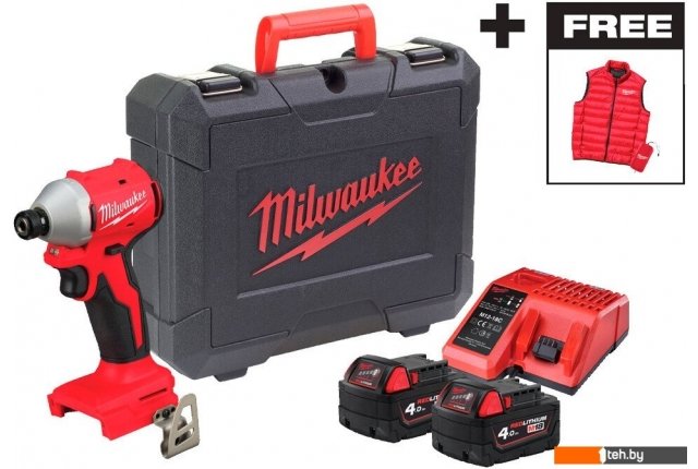 | Комплектация | - Аккумуляторный импульсный винтоверт Milwaukee M18 BLIDRC-402C (замена для 4933464534)( (Арт. 4933492840) - 1 шт - Аккумулятор Milwaukee M18 B4 4Ач (замена для 4931440022)( (Арт. 4932430063) - 2 шт - Быстрое зарядное устройство M12-M18 FC - 1 шт - Жилетка Milwaukee - 1 шт - Инструкция по эксплуатации - Кейс |