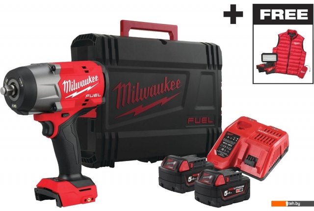 | Комплектация | - Аккумуляторный высокомоментный импульсный гайковерт с фиксацией фрикционным кольцом - 1 шт - Аккумулятор M18 B5 5.0 Ач - 2 шт - Быстрое зарядное устройство M12-18 FC - 1 шт - Аккумуляторный фонарь M18 ALIS-0 - 1 шт - Жилетка Milwaukee - 1 шт - Инструкция по эксплуатации - HD Кейс |