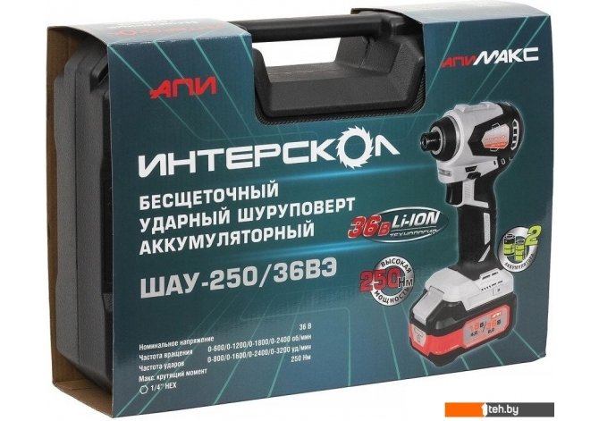 Фотографии, описание и технические характеристики модели Интерскол ШАУ-250/36ВЭ 862.2.2.70 (с 2-мя АКБ, кейс) взяты из открытых источников, официального сайта производителя или представительства Интерскол в Республике Беларусь.