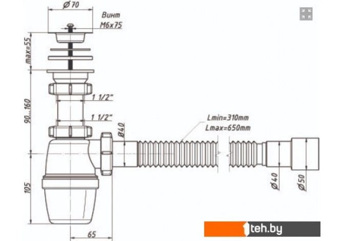 | Информация | Сифон с большим корпусом и отстойником, выпуском, нержавеющей чашкой D70 мм и гибкой трубой 40-40/50 для раковины или мойки. |
