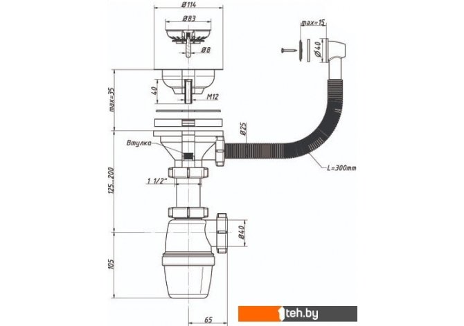 | Информация | Сифон с большим корпусом и отстойником, выпуском с нержавеющей чашкой D114 мм для мойки с круглым переливом. Необходим отвод в канализацию. |