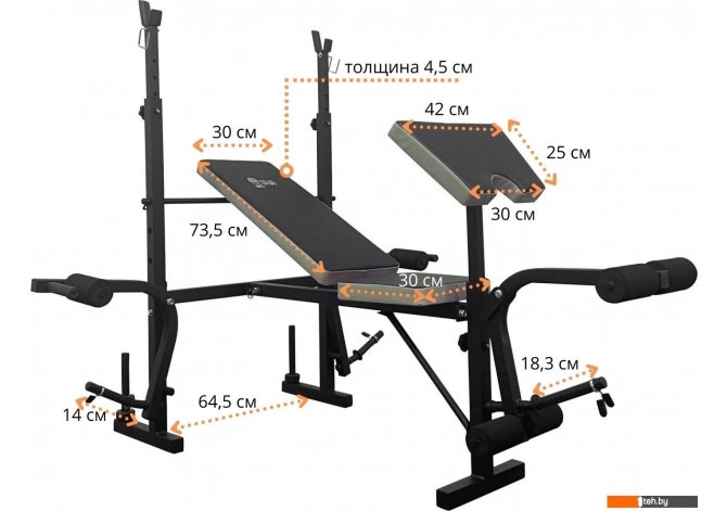 | Информация | - Силовая скамья Atlas Sport AS-1070 Grey — идеальный выбор для домашних тренировок! - Конструкция выполнена из прочного стального профиля, что обеспечивает надежность и долговечность. Многослойная порошковая окраска защищает металл и увеличивает срок службы тренажера. - Скамья предназначена для выполнения разнообразных упражнений, таких как жим штанги лежа, парта для бицепса и жим ногами. - Угол наклона спинки можно регулировать с помощью специального упора, а мягкие валики на тяге для ног обеспечивают комфорт и безопасность во время тренировок. - Обратите внимание, что диски для нагрузки приобретаются отдельно. - Высота стоек под штангу также регулируется, что позволяет настроить скамью под ваши индивидуальные параметры. |