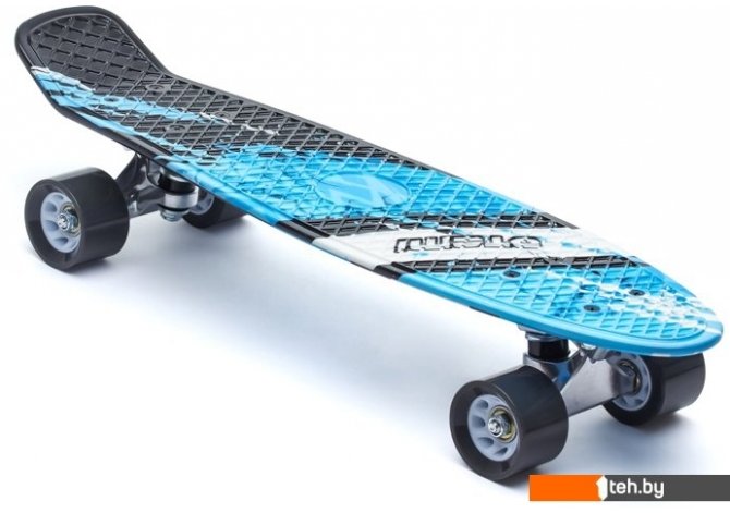 | Информация | Дека: 57x15 см, высокопрочный пластик; Рисунок: аквапринт; Колеса: 60*40 мм, PU, жесткость 72A; Амортизатор PU, жесткость: 85A; Трак алюминий размер 3,25", Подшипник: ABEC-7; Высота скейта 10 см и дистанция между колесами 32 см. Максимальная нагрузка - 100 кг. Вес: 1,7 кг. |