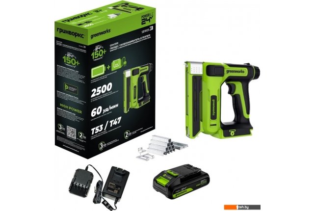 | Комплектация | - Степлер аккумуляторный Greenworks 24V G24CS10 (арт.3400107); - АКБ 24V 2Ач - 1 шт.; - ЗУ 24V 2А - 1 шт.; - Руководство по эксплуатации; - Гарантийный талон; - Коробка. |