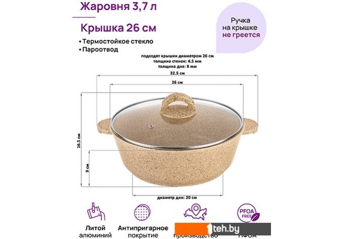 | Информация | ? Жаровня-сотейник «Медовый гранит» из серии «Гармония вкуса» с крышкой и толстым дном равномерно разогревается, сохраняя сочность и полезные свойства продуктов. ? Выполнена в стильном дизайне, имитирующим гранит, из толстостенного литого алюминия с ультрапрочным антипригарным покрытием Cookmark. ? Покрытие устойчиво к царапинам, безопасно для здоровья и не содержит вредных веществ. ? Толстые стены и плотная крышка из жаропрочного стекла создают эффект духовки, обеспечивая равномерную циркуляцию. ?? Эксплуатация: не нагревать без продуктов, использовать только деревянные и силиконовые приборы, не мыть абразивными или щелочными моющими средствами. ? Подходит для всех типов плит, кроме индукционных, и может использоваться в духовом шкафу без крышки при температуре до 250 градусов. ? Кухонный инвентарь в стильном дизайне станет отличным подарком для любой женщины. ? В серии «Гармония вкуса» также представлены сковороды, кастрюли, блинницы, казаны и жаровни. |