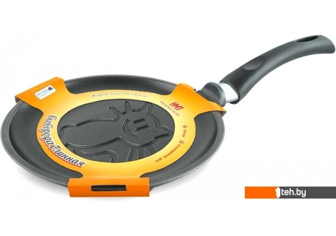 Информация | Блинная сковорода имеет низкий борт и удобную ручку, благодаря чему легко переворачивать и снимать блины. Утолщенное дно обеспечивает особые термоаккумулирующие свойства: блин равномерно пропекается по всей толщине и красиво румянится с обеих сторон. Благодаря антипригарному покрытию блины всегда легко снимаются со сковороды и не пригорают, даже при выпекании без использования масла. Дизайн корпуса сковороды разработан так, чтобы при выпекании не нарушалась целостность блина, и красиво румянился рисунок. |