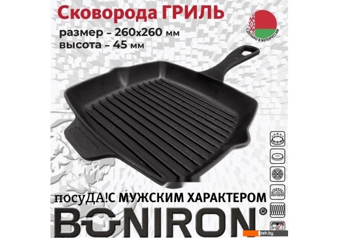Информация | - Сковорода-гриль BONIRON ВГ26-01 из чугуна отлично подходит для жарки мяса, рыбы и овощей. - Она имеет удобные ручки для переноски и использования. - Сковорода-гриль BONIRON ВГ26-01 подходит для всех типов плит, включая индукционные. - Подробную информацию по эксплуатации чугунной посуды и уходу за ней можно найти в дополнительных материалах. |