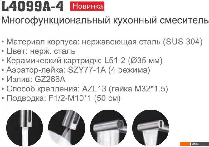 | Информация | Особенности:_x000D_ _x000D_ лейка не выдвигается._x000D_ в базовом положение лейка поворачивается на 360 градусов._x000D_ у лейки четыре грани с аэраторами._x000D_ 4 режима, струи у лейки._x000D_ переключение режимов поворотом лейки на 90 и нажатием кнопки на лейки._x000D_ режим 1 (базовый) (обычная струя из торца лейки)._x000D_ режим 2 (широкая и мощная струя из торца лейки, вкл. нажатием кнопки на лейке)._x000D_ режим 3 (водопад, из боковой грани лейки, мощный, вкл. поворотом лейки на 90 градусов)._x000D_ режим 4 (водопад, из боковой грани лейки, мягкий дождь, вкл. поворотом лейки на 90 градусов). |