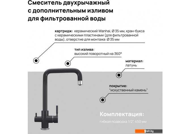 | Информация | - Смеситель MAUNFELD MFQT-19DGR предлагает тройной подвод воды через один излив: холодная, горячая и фильтрованная. Переход между ними осуществляется поворотом рычага, а набор для подключения к фильтру уже включен. Система фильтрации приобретается отдельно и устанавливается под мойку. Специальный индикатор подскажет, когда нужно заменить картридж. Корпус изготовлен из высококачественной латуни и окрашен под "искусственный камень". Внутри установлен керамический картридж от известного бренда Wanhai диаметром 35 мм, который выдерживает до 500 тысяч циклов "открывания-закрывания". - Специальная силиконовая смазка на подвижных частях и керамические пластины из 96% оксида алюминия обеспечивают долговечность и плавность работы. Смеситель оснащен съемным пластиковым аэратором для экономии воды и поворотным изливом на 360 градусов. В комплект входят: керамический картридж Wanhai, гибкая подводка, крепежные элементы, кран-букса с керамическими пластинами для дополнительного излива фильтрованной воды, набор для подключения фильтра (гибкая подводка + переходник-цанга), технический паспорт и гарантийный талон. |