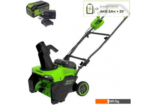 | Комплектация | - Снегоуборщик аккумуляторный 40V GD40STX2 (арт.2603407); - Аккумулятор Greenworks 40V, 5 A/ч; - Зарядное устройство Greenworks 40V, 2А; - Руководство по эксплуатации; - Гарантийный талон. |