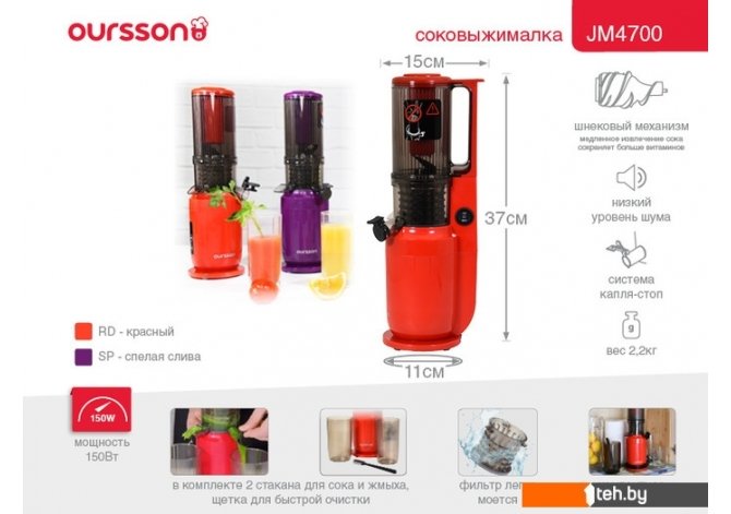 Фотографии, описание и технические характеристики модели соковыжималки Oursson JM4700/RD взяты из открытых источников, официального сайта производителя или представительства Oursson в Республике Беларусь.